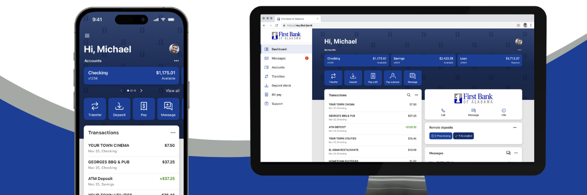 With Online and Mobile Banking, you can access and manage your First Bank of Alabama accounts from your couch, office or wherever you have a computer and a secure internet connection. Do things like: